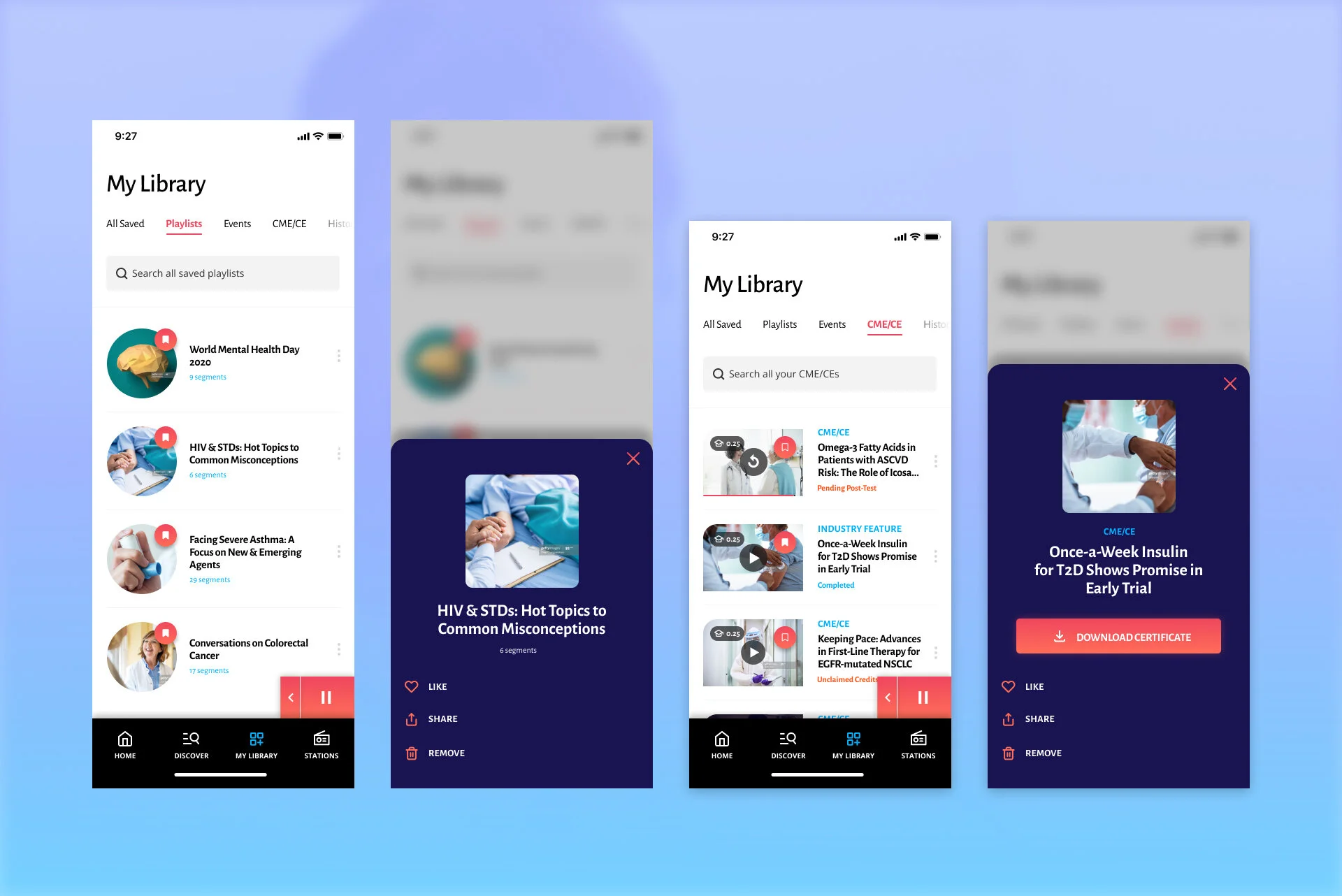 Considering ReachMDs high publishing velocity our key focus was on supporting users during content discovery across a variety of content types and areas of expertise based on each user’s unique professional profile. The ability to safe, share and bookmark content enables users to curate a library of knowledge available to them at the tip of their fingers. ReachMD’s 24/7 radio with several industry specific stations is a constant companion while allowing users to multi-task and explore content simultaneously.