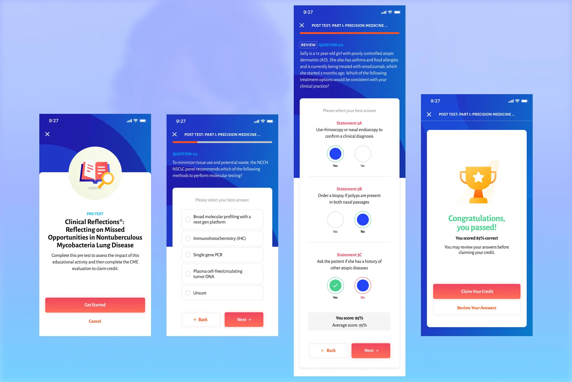 As a way to support medical professionals in earning CME/CE credits, which are essential to maintain their medical license, we created an engaging quiz engine that supports a variety of formats with an intricate notification and badging system to gamify the overall experience and maintain momentum and user retention.